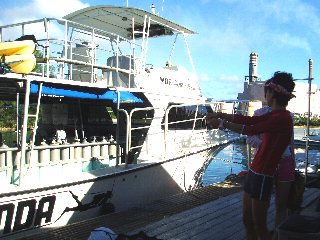 | 真っ青なマリアナブルーの海を快走します。 ポイントまでは1時間以内。 ボートはトイレやシャワー設備も整っているので快適です。 後の2人は、お世話になったショップ「ジェントリーブルー」のガイドのトニーとユウちゃんです。 |