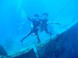 | 2本目は「アメリカンタンカー」 アプラ湾内に、巨大なタンカーが傾いて沈んでいます。 ロタの松運丸と違い、船体もそのまま残っており、船倉に入ることもできました。湾内なので、少し透視度が落ちます。海から上がると、あんなに晴れていたのに強烈なスコールに遭いました。 |